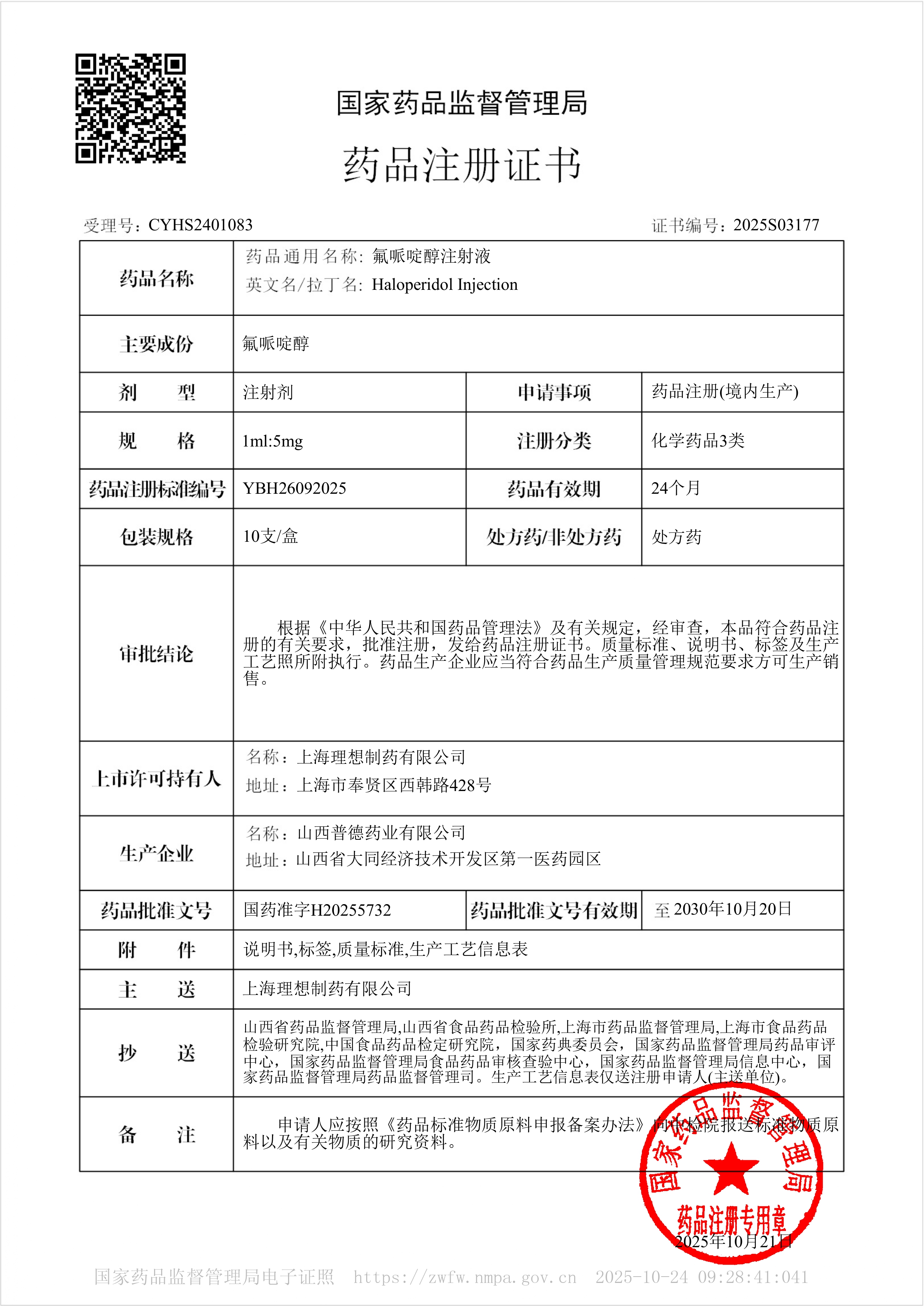 2025年10月21日,我公司的氟哌啶醇注射液获批上市,该产品按化学药品新注册分类获批,视同通过一致性评价。此药物属于国家基药、医保甲类药品。